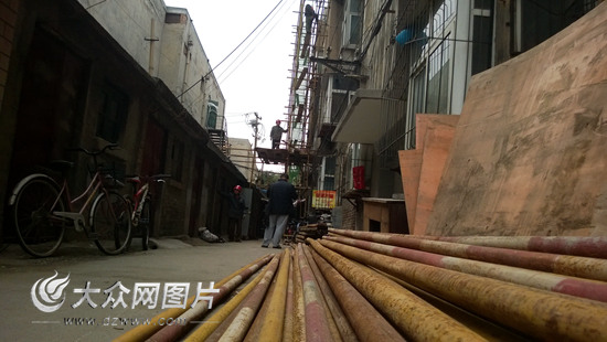 大眾網記者今天上午在現場看到,這棟居民樓第一單元的腳手架已經搭建完畢,幾名工人正在有條不紊地安裝第二單元的腳手架。現場工人告訴大眾網記者,他們是從昨天開始工作的,正在做居民樓維修前的準備。