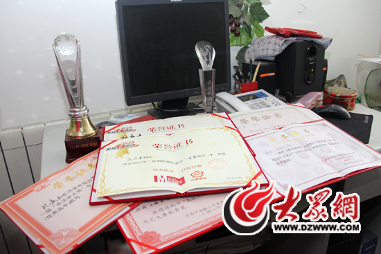 多年來老人參加表演和比賽獲得的諸多證書和獎杯。