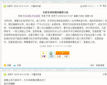 有網(wǎng)友在大眾網(wǎng)德州論壇曝光德州城管對(duì)一中校門口的學(xué)生自行車進(jìn)行“收繳”,導(dǎo)致學(xué)生“因晚上找不到車子,大多回家都凌晨了”,網(wǎng)友稱被城管收走的學(xué)生...