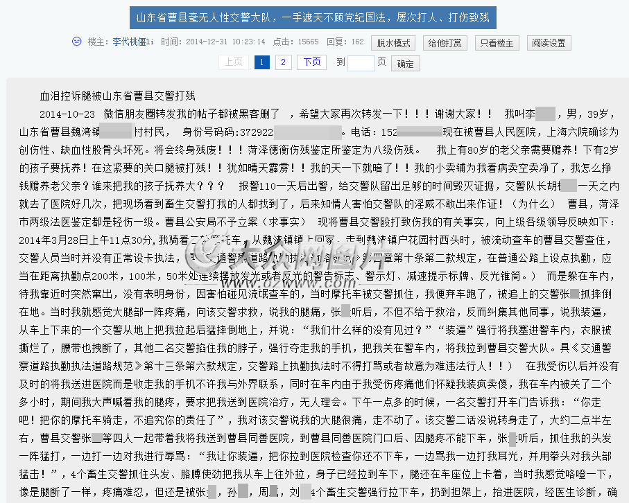 《血淚控訴腿被山東省曹縣交警打殘》、《山東省曹縣交警打殘人》、《交警暴力執法打殘廢》、《山東省曹縣交警打殘李某不管不問》……自2014年4月起,近十條類似標題的帖文被發布在網上。發帖的是山東菏澤曹縣魏灣鎮某村村民李某,描述的是李某遭遇曹縣交警大隊交警人員“暴力執法”致其腿部殘疾的經歷。