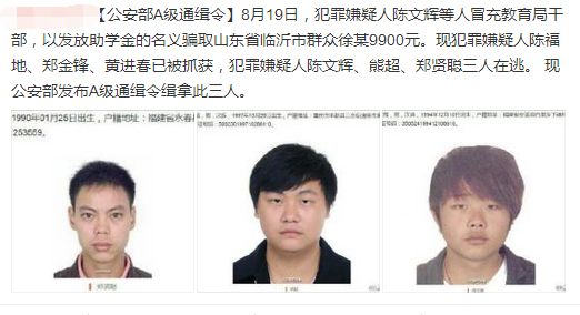 8月26日18:21,公安部刑偵局通報稱,詐騙徐玉玉的犯罪嫌疑人已經有3人被抓獲,另有陳文輝、鄭賢聰和熊超3人在逃。同一時間,公安部發出最高級別的A級通緝令,公布了3名在逃犯罪嫌疑人的身份信息和照片,對發現線索的舉報人、協助緝捕有功的單位或個人,每抓獲一名犯罪嫌疑人將給予人民幣5萬元獎勵。