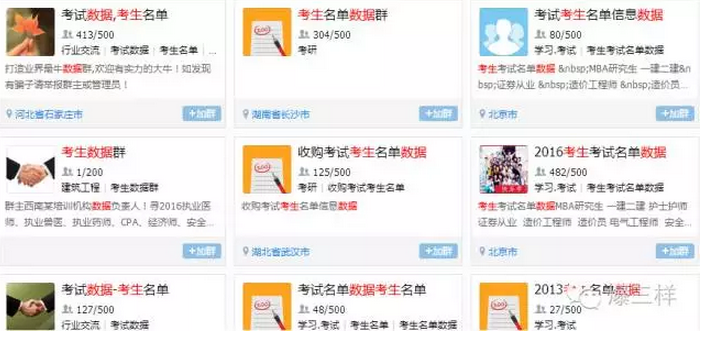 記者在網上搜索了與“考生數據”有關的QQ群,發現基本上全國各地都有販賣考生數據的QQ群,每個群里多則800多人,少則十幾人。