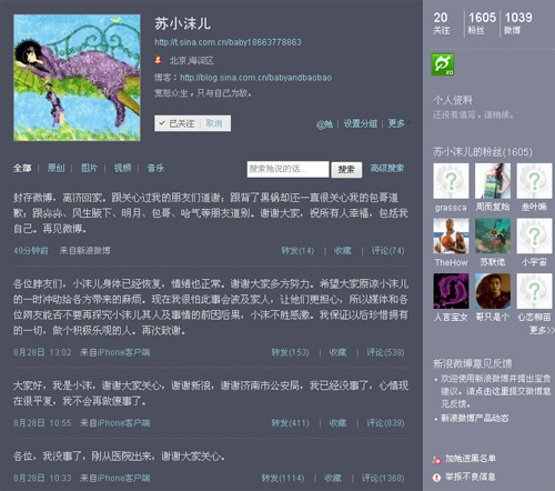8月28日發(fā)生的“蘇小沫兒”微博直播“自殺”一事受到博友和媒體的廣泛關(guān)注。記者在其微博上注意到,身體已經(jīng)恢復(fù),情緒漸已正常的“小沫兒”表示,保證以后珍惜一切。此后,她將封存微博。... ...