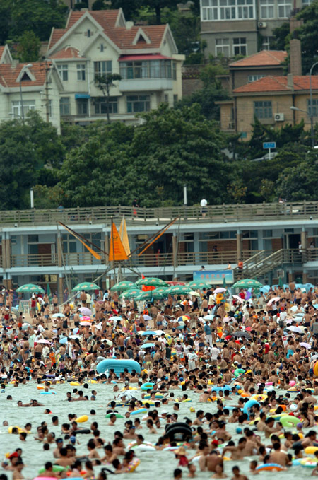 The NO.1 Bathing Beach in east China's Shandong Province is packed with visitors Saturday, July 22, 2006. With the arrival of a travel season, bathing beaches in the city have become a hot cake with tourists. [Xinhua]