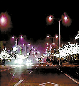 整治后的膠南小辛河除沿河安裝了路燈外,還安裝了紅綠護欄燈;珠海路、北京路和人民路兩側樹木也掛滿了晶晶亮、滿天星燈飾,就像一棵棵五彩繽紛的圣誕樹(如左圖)。   (崔坤法)