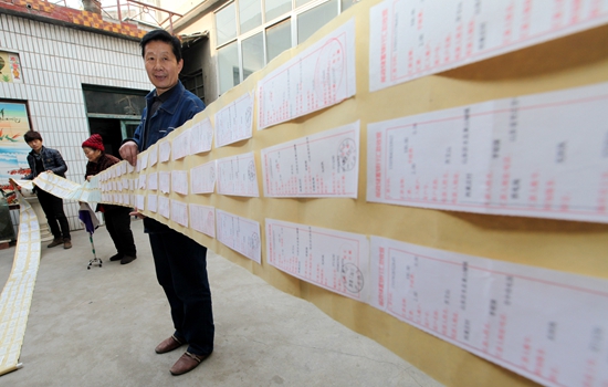 自1995年起,李明強堅持每月從做農電工的工資中拿出100元錢資助貧困家庭。如今,為了方便保存,他把20年來保留的匯款收據有序排列粘貼在一起,形成了12米長的特殊“匯款單”。