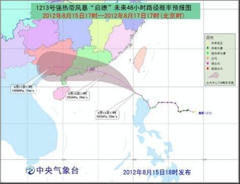 中央氣象臺(tái)監(jiān)測(cè),“啟德”于17時(shí)進(jìn)入南海東北部海面,目前距離廣東省深圳市750公里(北緯19.2度,東經(jīng)120.3度),中心附近最大風(fēng)力有10級(jí)(28米/秒),中心最低氣壓為985百帕。預(yù)計(jì),“啟德”將以每小時(shí)20~25公里的速度向廣東沿海靠近,強(qiáng)度繼續(xù)加強(qiáng),并將于16日晚上到17日白天在廣東惠來(lái)到湛江一帶沿海登陸,登陸時(shí)強(qiáng)度可能為臺(tái)風(fēng)(12級(jí))。