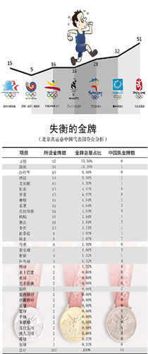 然而,金牌數量的快速增長,卻無法掩蓋項目結構失衡、生產方式單一、金牌成色不足的現實。在我國自1984年出征奧運會所收獲的獎牌中,跳水、舉重、體操、乒乓球、射擊和羽毛球這6個傳統優勢項目摘取的金牌數,竟然占到金牌總數的七成以上。幾大傳統優勢項目的持續堅挺,不但令對手驚嘆不已,而且也與基礎大項的不見起色、三大球的日漸低迷和弱勢項目的積重難返形成鮮明反差。