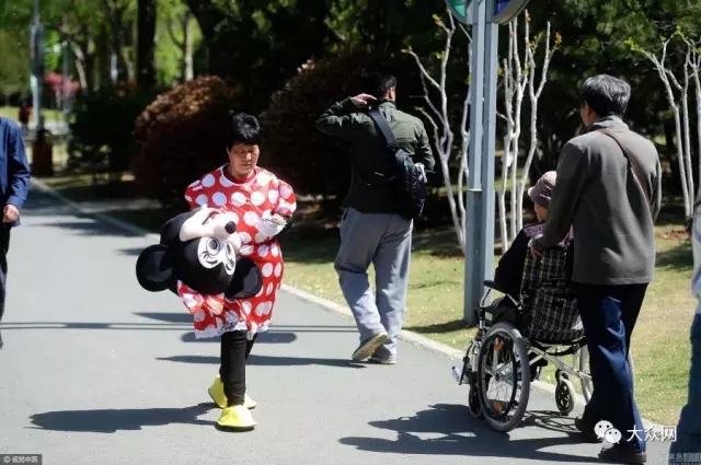 為了讓兒媳婦得到更好的治療,銀丕芝決定干些力所能及的活,幫她籌款治病。正好兒子有朋友是搞演出活動的,她便借來這身衣服,去跟人合影籌款。最近隨著濟南的溫度逐漸升高,老人開始感覺有些吃力了。開始的時候,銀丕芝還能勉強應付,當有孩子跑到她身邊要求照相時,她還能蹲下身子,跟他們聊幾句。但很快,她就會大汗淋漓,有些吃不消了。每當這時她就坐在附近休息一會兒,感覺沒問題了,套上頭套繼續表演。她說希望自己能夠堅持下去,希望能夠多籌些錢,用以支撐這個傾斜的家庭。
