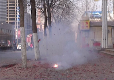 解說:記者在街頭看到,商家在放開門炮時,不少市民都繞著走,另外,站在高處遠遠望去,濟南上空被一片煙霧籠罩,這些都是煙花爆竹惹的禍。不少市民對于開門炮的燃放也有自己的看法。