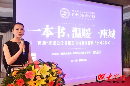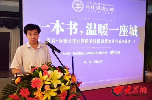 在今天的落成儀式上,大眾網董事長、總經理林忠禮表示,今年是山東網絡文化建設重點發展的一年,也是大眾網普及文化閱讀的實施年。作為山東省首個社區讀書館,保利海德公館社區讀書館的落成,既是新聞媒體發揮橋梁紐帶作用,搭建文化建設平臺的重要成果,也是保利海德公館注重社區文化建設、提升社區人文素養的重要體現。