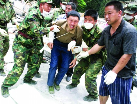 5月16日上午,四川彭州龍山鎮九峰村,濟南軍區某集團軍數十名官兵經過3個多小時的尋找,在廢墟中找到了遇難村民的遺體,遇難者的兒子汪松嚴感激之下,當眾給解放軍下跪,被大家攙起。 本報山東救援隊隨隊記者張貴君通訊員施文標攝