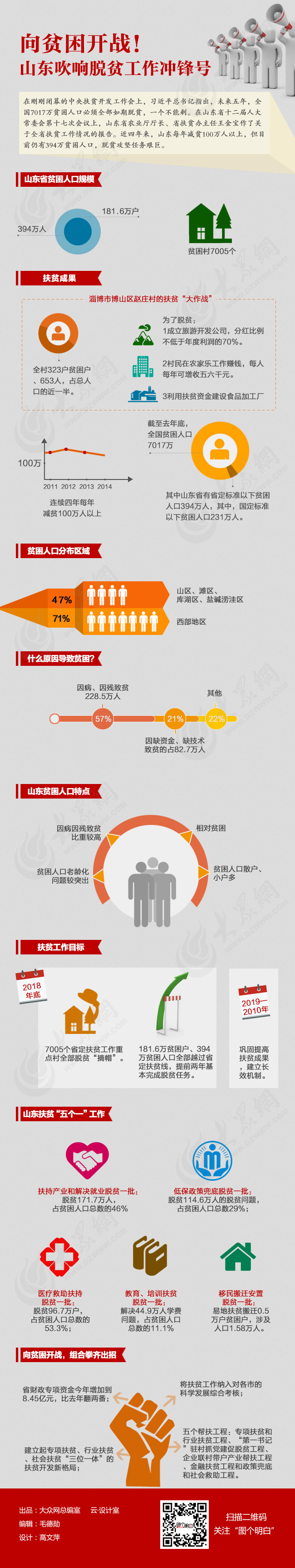 為完成2018年全省全部脫貧的目標,山東將推進“五個一批”工作向貧困“宣戰”,即通過扶持產業和解決就業脫貧一批;通過低保政策兜底脫貧一批;通過醫療救助扶持脫貧一批;通過教育、培訓扶貧脫貧一批;通過移民搬遷安置脫貧一批,主要解決符合國家有關規定、有意愿進行易地扶貧搬遷貧困戶的脫貧問題。