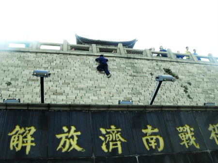 6日下午,在濟南解放閣,一些家長帶著孩子在攀爬高高的石墻,讓人不禁為孩子們捏了一把汗。