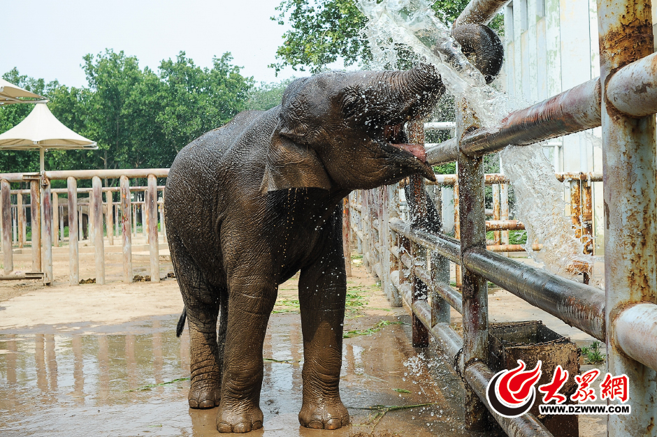 近日,山東再次出現大范圍高溫天氣,濟南最高氣溫達到36℃,開啟“桑拿”模式。濟南動物園開始啟動各種降溫方案,給動物們消暑。圖為飼養員潑水為大象降溫解暑。大眾網記者 王長坤 攝