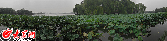 連日來,小雨降臨泉城,雨滴打在荷葉上,給了大明湖一種別樣的美。 (見習(xí)記者 孫博洋 攝)