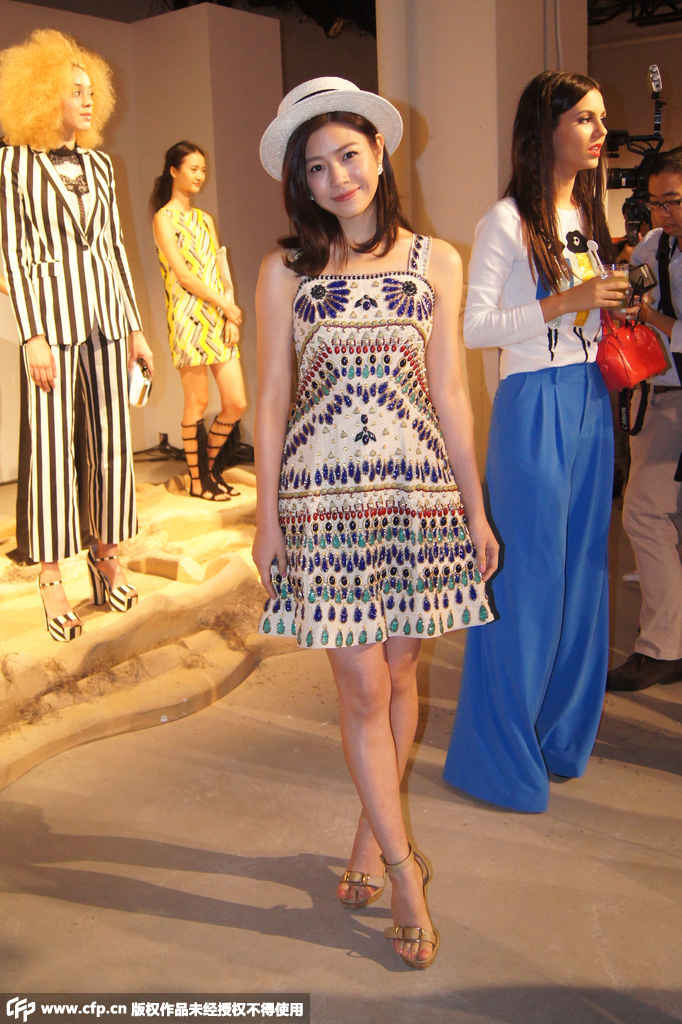 2015年9月16日訊,紐約,當地時間9月15日,2016紐約春夏時裝周:Alice+Olivia秀場。陳妍希俏麗印花吊帶裙甜美宜人。