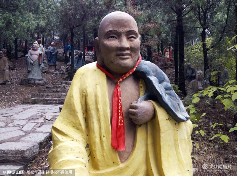 2015年11月15日,山東日照,莒縣浮來山風(fēng)景區(qū)內(nèi)幾十個羅漢雕塑被游客系上祈福紅布條。