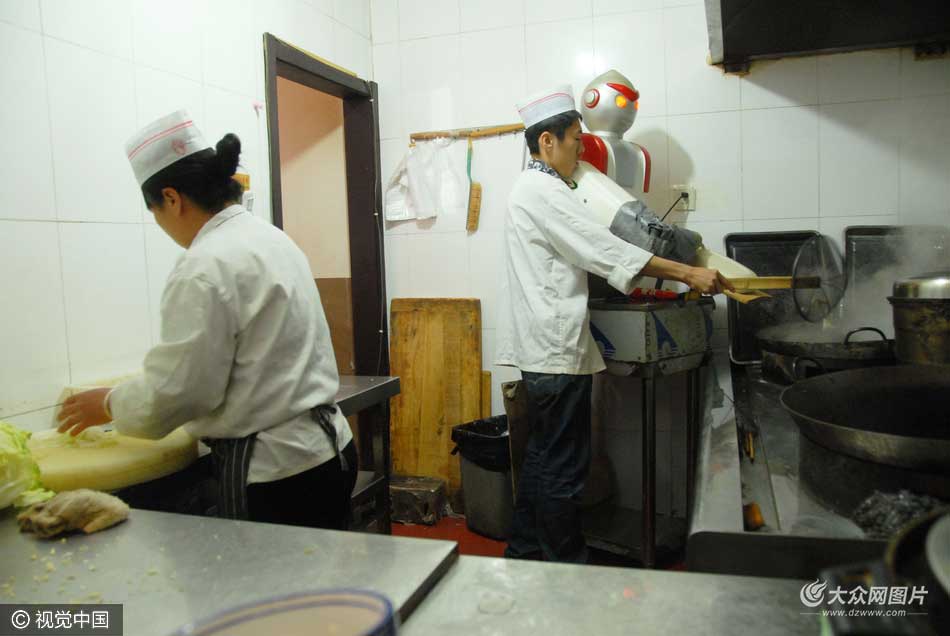 2016年4月14日,北京一家山西風味餐館的廚房內,一名機器人大廚在制作刀削面。據了解這個被飯店員工叫做“奧特曼”的刀削面機器人已經工作了兩年多,從沒出過故障,工作時平均十秒鐘能削好一碗面,店員們笑稱它是永不休假的優秀員工。