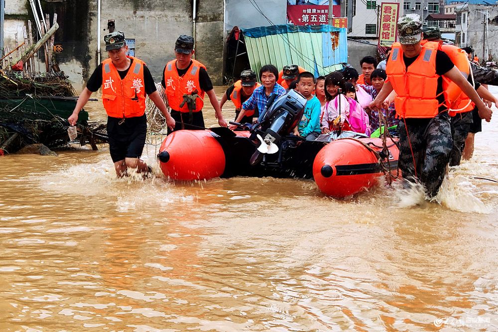 2019年6月11日,廣東河源,消防人員在連平縣上坪鎮轉移被困居民。據廣東省河源市防汛防旱防風指揮部辦公室統計,截至6月11日,暴雨導致河源全市63個鄉鎮不同程度受災,因災死亡7人,失聯1人,受傷3人,受災人口11.455萬人,倒塌房屋956間,轉移人口1.454萬人。 其中,連平縣部分鄉鎮受災較嚴重,因災死亡6人(4女2男),直接經濟損失約1.5億元人民幣。 陳驥旻(廣東分社)/中新社/視覺中國