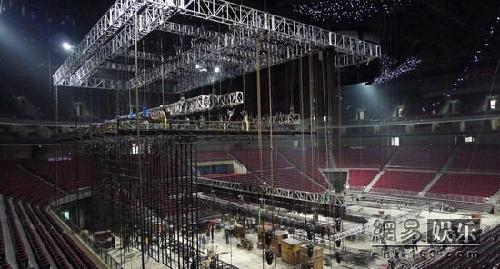 五棵松體育館內工作人員還在為舞臺忙碌。