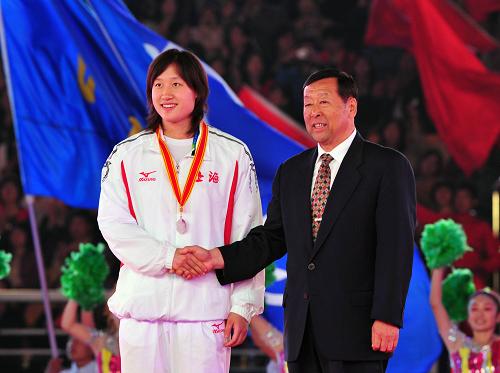 游泳運動員劉子歌(左)在閉幕式上領(lǐng)獎。