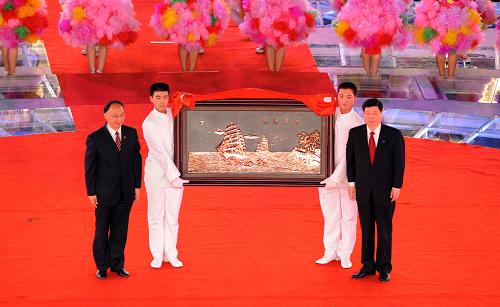 國家體育總局局長劉鵬(左)代表國家體育總局向山東省贈送紀念品,山東省委書記、省人大常委會主任姜異康接收紀念品。新華社記者范長國攝