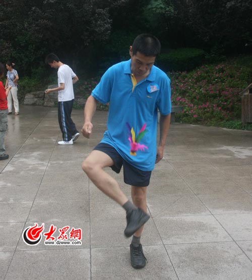 大眾網(wǎng)濟南7月18日訊(大眾網(wǎng)-生活日報聯(lián)合報道組 記者 趙新婷 司君波 燕雨 實習(xí)生 王磊)“踢得好!漂亮!”在今天的社區(qū)嘉年華比賽現(xiàn)場,一位穿著藍(lán)色上衣的中年人吸引了人們的目光,只見毽子在他的各種姿勢下旋轉(zhuǎn)、跳躍,不僅是踢毽子,跳繩、滾鐵環(huán)、抽“老牛”,都在田杰先生的手上玩出各種花樣,現(xiàn)場的人們都不禁親切的叫他“全能王”。最終,“全能王”田先生也不負(fù)眾望,拿到了滾鐵環(huán)和抽老牛的亞軍,以及踢毽子和跳繩的季軍共四個獎項。