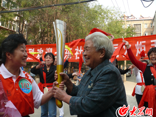 “這是上午剛剛在火炬傳遞儀式上用過的‘如意’火炬,大家都傳傳!睘榇蠹規怼叭缫狻钡氖巧鐓^黨總支書記田寶明,她剛剛作為十一運會濟南火炬傳遞的102號火炬手參加了上午的火炬傳遞活動。當田寶明將手中的“如意”火炬傳給社區居民李玉英老太時,人群中迸發出熱烈地掌聲和歡呼聲。