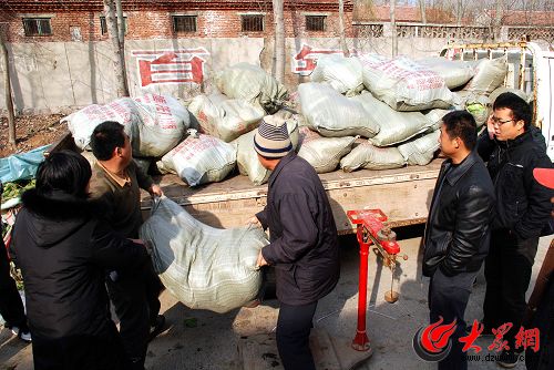菜農(nóng)正在和愛心市民搬運(yùn)過完秤的白菜。齊魯晚報(bào)記者 郭建政 攝