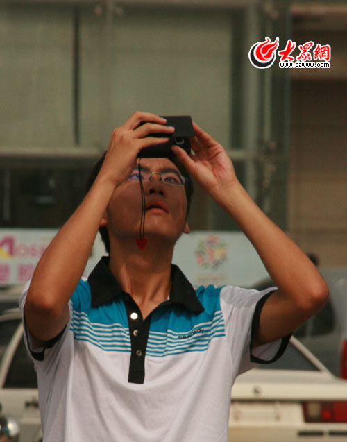 大眾網濟南7月22日訊(記者 趙爾印 陳宏發 實習生 王磊) 墨鏡、墨水盆、X光片、膠片、電焊濾光玻璃、專業濾鏡……今天早上,濟南的大街上到處有都觀看日食的市民,但并不是每個人都戴上專業觀測眼鏡,大家各出奇招看日食,既飽嘗了這場世紀天文盛宴,又節省了成本,一舉兩得。