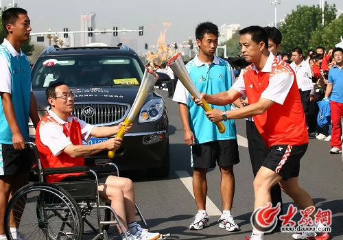 濰坊市委書(shū)記張新起將火炬交到市體育局局長(zhǎng)耿文手中。
