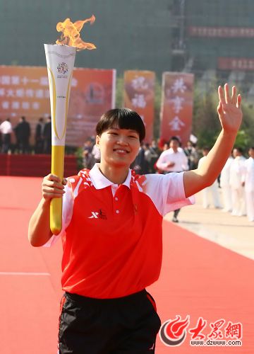 大眾網濰坊9月22日訊 今天,一個陽光明媚的金秋時節,濰坊市迎來了全運火炬,這也是火炬傳遞山東省第四站。上午九點,啟動儀式在濰坊市人民廣場舉行,有90名火炬手參加了火炬傳遞,傳遞路線主要在勝利街進行。第一棒火炬手是奧運冠軍林偉寧,有近10萬市民在道路兩側夾道歡迎火炬手,為他們搖旗吶喊。