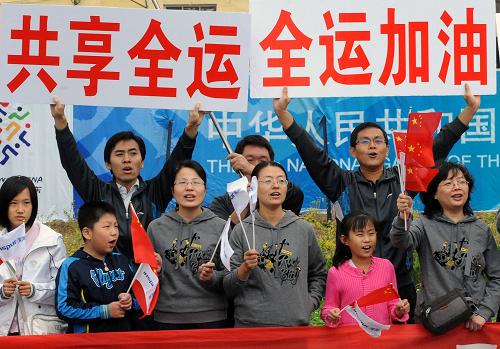 10月8日,聊城市民為火炬?zhèn)鬟f活動助威加油。當日,第十一屆全國運動會火炬?zhèn)鬟f活動在山東聊城進行。