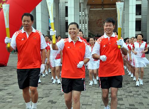 9月11日,九運會帆板冠軍王麗芳(中)、中國石化海南公司全國勞動模范陸建平(左)和群眾體育先進工作者馮川建在傳遞火炬。當日,以“祝福祖國,共享全運”為主題的第十一屆全國運動會火炬傳遞活動海南省火炬傳遞起跑儀式在?谑信e行。 新華社記者周慧敏攝