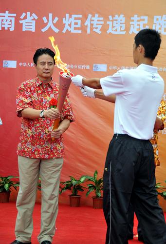 9月11日,圣火護衛隊員點燃海南省省長羅保銘(左)手中的火炬。當日,以“祝福祖國,共享全運”為主題的第十一屆全國運動會火炬傳遞活動海南省火炬傳遞起跑儀式在海口市舉行。 新華社記者周慧敏攝