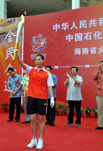 9月11日,九運會帆板冠軍王麗芳擔任全運會火炬傳遞海口站第一棒火炬手。當日,以“祝福祖國,共享全運”為主題的第十一屆全國運動會火炬傳遞活動海南省火炬傳遞起跑儀式在海口市舉行。 新華社記者周慧敏攝