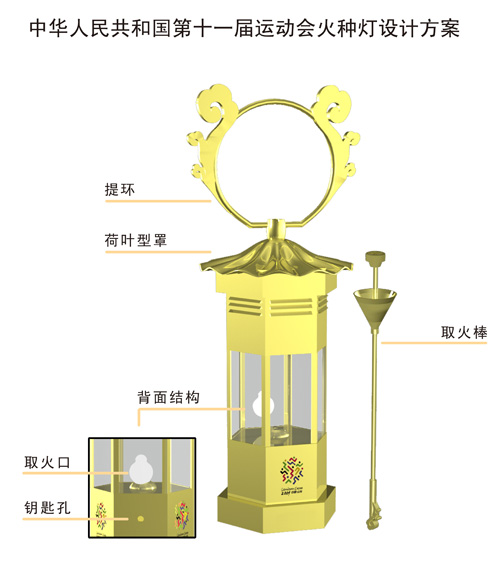 據火種燈設計者介紹,十一運會火種燈采用中國傳統吉祥物件“如意宮燈”為設計元素,與“如意”火炬相得益彰!叭缫鈱m燈”頂部采用荷葉紋飾造型處理,既具有深厚的文化積淀,又有全運會主賽區濟南“四面荷花三面柳”的城市特色;提手處用如意紋飾裝飾,造型古樸、典雅、精煉,寓意雋永,表達了如意吉祥的美好祝福。