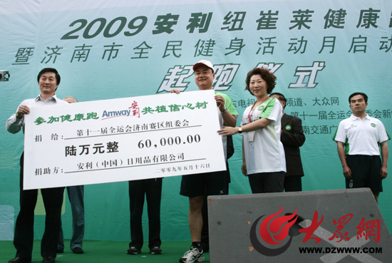 在起跑儀式上,安利(中國)日用品有限公司山東副總監王海軍講話并向第十一屆組委會領導捐贈6萬元支票。據悉,此次捐贈的支票全部用于全運村的綠化,是安利(中國)今年特別為迎接是十一屆全運會而啟動的“參加健康跑,共植信心樹”公益項目。隨著發令槍槍聲的響起,王總與杜麗及相關領導帶領著“萬人大軍”共同起跑。