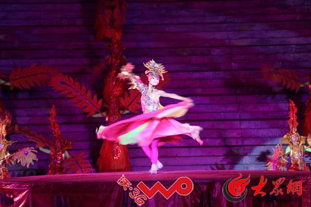 除了精彩的歌舞表演,現場的燈光也十分絢麗,激光燈的編織效果使夜色中的湖心島披上了如夢如幻的色彩。同時,燈光在舞臺上做出的微波蕩漾的藍色水面,更增加了奇妙感。