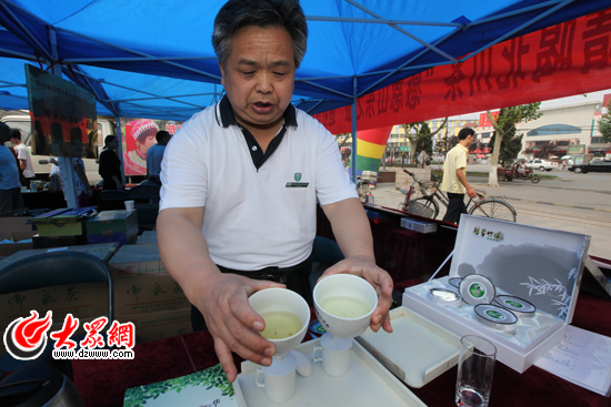 在活動現場一角,濟南市茶業批發市場從事14年之久的品茶師薛德全表演了一番精彩的茶藝。“把盤——沖泡——看、聞、品、捏”,一系列工序下來之后,讓市民們見識到了怎樣鑒別好茶。“北川茶不錯,葉質均勻,湯色黃綠、清澈鮮亮,茶香濃厚,耐沖泡。”薛德全歷數北川茶的優點,對茶質贊不絕口。