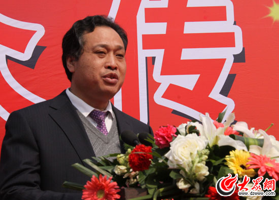 3月28日,中建八局二公司董事長韓興爭在大眾傳媒大廈奠基典禮上致詞。
