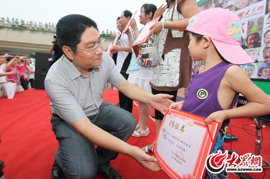 大眾網7月18日訊(記者 馮煒程 曹亮 燕雨 趙洪棟)7月18日下午,由大眾網聯合世界知名品牌海爾共同發起的“海爾杯世博笑臉”有獎征集活動頒獎儀式在泉城廣場舉行。經過40多天的作品征集和投票角逐,38張幸運笑臉從2000余幅作品中脫穎而出,并分享了5個獎項,其中大眾網網友宋家旭的笑臉作品被評為特等獎,從而得了雙人免費游世博的機會。上海世博會山東館輪值副館長李影、大眾網總編輯朱德泉、海爾集團濟南營銷中心總經理李鵬等為獲獎網友頒獎。