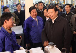 姜省長在生產車間不時駐足和員工親切交談,他握住一名員工的手,噓寒問暖。