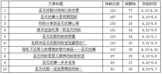 如“圣元優(yōu)聰對媽咪們的關(guān)愛”此標題在論壇中被轉(zhuǎn)載222篇次。其次,不同標題相同內(nèi)容的文章也大批量出現(xiàn)在各大論壇中。根據(jù)網(wǎng)絡(luò)熱度分析顯示,如此大量內(nèi)容相同的帖子就可認定為“水軍”所為,意在誤導通過網(wǎng)絡(luò)獲取商品信息的消費者。如下圖所示: