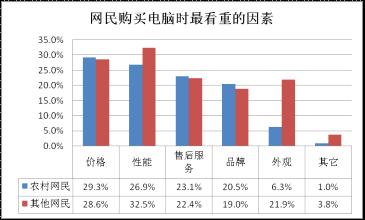 通過第一個圖表可以看出,被調查農村網民在購買電腦時最為看重的因素是價格、性能、售后服務以及品牌,他們對于產品外觀的重視程度相對較低。