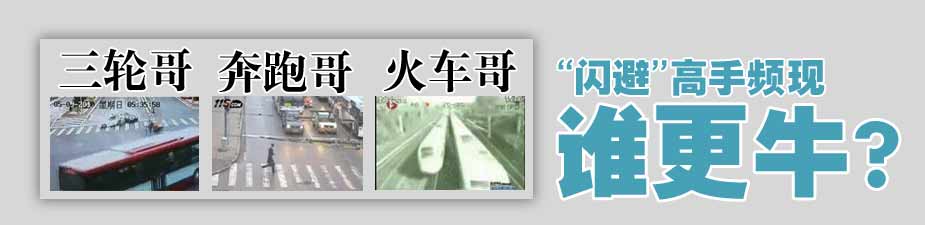 如果死神迎面逼來(lái),你會(huì)有何反應(yīng)?“三輪哥”在連環(huán)車禍中“漂移”而過(guò),引來(lái)網(wǎng)友一片膜拜;隨后,人行道上“奔跑帝”與發(fā)狂的公交車擦身而過(guò),留下網(wǎng)上一片驚嘆;昨日,網(wǎng)上又出現(xiàn)了一位先后跳躍躲避于兩列呼嘯而過(guò)的火車間的“火車帝”,網(wǎng)友們?cè)隗@嘆的同時(shí)感慨地稱之為“神跡”。