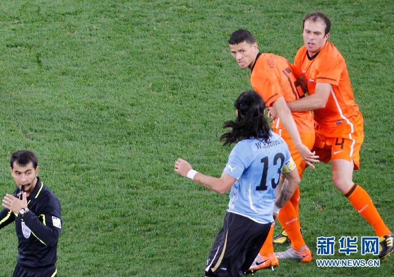 7月6日,在比賽補時階段,荷蘭隊球員博拉魯茲(右二)與烏拉圭隊球員塞·阿布魯(左二)發生爭執。當日,在開普敦綠點球場舉行的2010南非世界杯足球賽半決賽中,荷蘭隊以3比2戰勝烏拉圭隊,晉級決賽。新華社記者廖宇杰攝