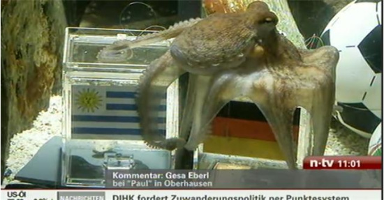 北京時間7月9日下午17時消息,德國奧博豪森海洋館的章魚“保羅”做出最新預測,在德國與烏拉圭的季軍爭奪戰中,德國隊將戰勝烏拉圭隊。隨后的決賽預測中,章魚保羅選擇了西班牙。媒體來源:新浪體育
