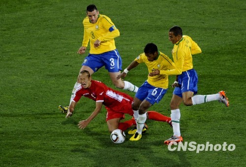 當地時間6月15日晚,南非世界杯G組小組賽巴西對陣朝鮮的焦點戰在約翰內斯堡舉行,朝鮮前鋒9號鄭大世在比賽爭奪時摔倒。鄭大世現在日本川崎前鋒隊踢球。和其他土生土長的朝鮮隊員不同,鄭大世出生在日本名古屋。他從小就就讀于“在日本朝鮮人總聯合會”下屬學校。 中新社發 廖攀 攝